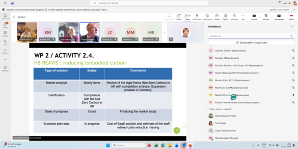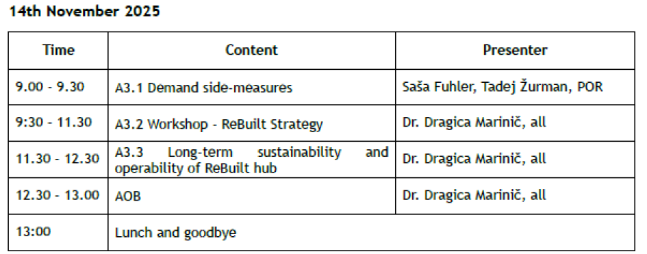 The second day centered on strategic and long-term topics. Sessions covered demand-side measures (A3.1), followed by an interactive workshop on the ReBuilt Strategy (A3.2). Discussions continued with a focus on the long-term sustainability and operability of the ReBuilt Hub (A3.3), ensuring continued impact beyond the project’s lifetime. The meeting closed with final remarks and a joint lunch, reinforcing collaboration among partners as the project approaches its final milestones.