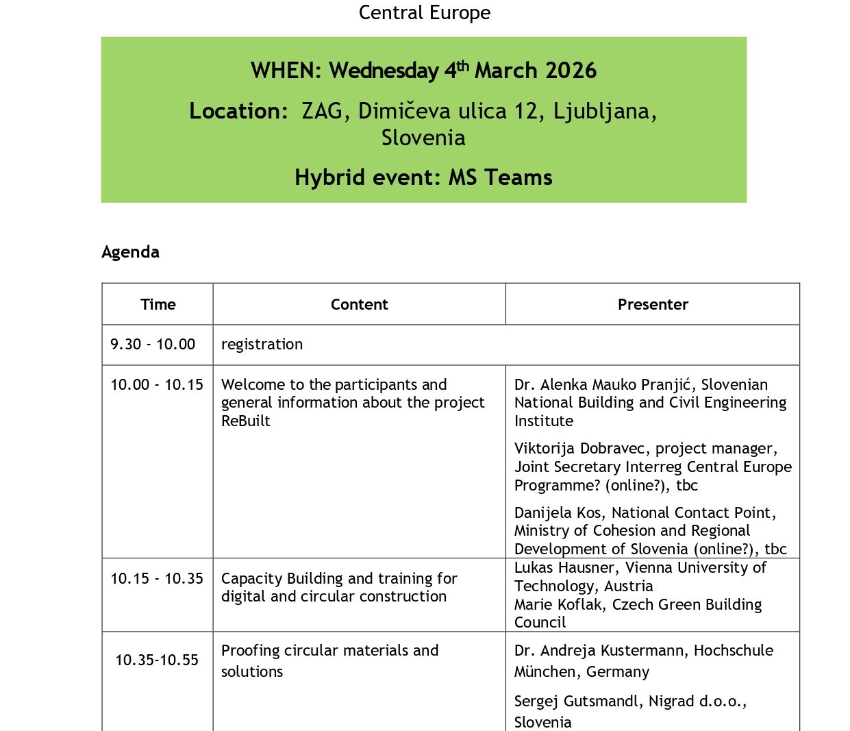 The final ReBuilt conference will take place in early March in Ljubljana, Slovenia, as an event for ReBuilt partners and the public. Participation is possible both on site and via an online platform after registration. The programme will open with a welcome session and an overview of project achievements, followed by presentations focusing on capacity building and training for digital and circular construction. Participants will gain insights into the testing and validation of circular materials and solutions, as well as into digital tools that enhance transparency and traceability in the construction sector. A dedicated session will introduce regional circular and digital construction hubs and present a common strategy developed within the project framework. The event will conclude with a round table discussion on future steps and long-term cooperation in circular and digital construction across Central Europe, alongside opportunities for networking and exchange.