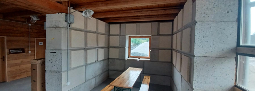 The pilot installation of sustainable acoustic panels was carried out within Activity 2.2 – Upscaling and testing of green and bio-concrete products. This activity focuses on the transnational upscaling of green concrete made with 100% recycled aggregates and bio-based concrete solutions, including hempcrete panels for sound and thermal insulation as well as fibre-reinforced concrete. Previously developed through national and cross-national cooperation, these materials were further advanced within the ReBuilt project by partners PP6, PP2, PP3, PP10 and PP14. The activity includes laboratory investigations and small-scale pilot applications in existing rural and urban buildings in Slovenia and Bavaria. By promoting recycled and bio-based raw materials, the initiative contributes to reducing CO₂ emissions, conserving natural resources, and enhancing circularity through eco-design principles supported by life cycle assessment methodologies.
